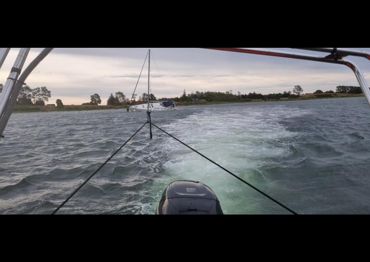 En 47 fods sejlbåd havde ligget for svej med deres anker men ud på morgen blæste det op og de drev ind på 1,5 meter vand.